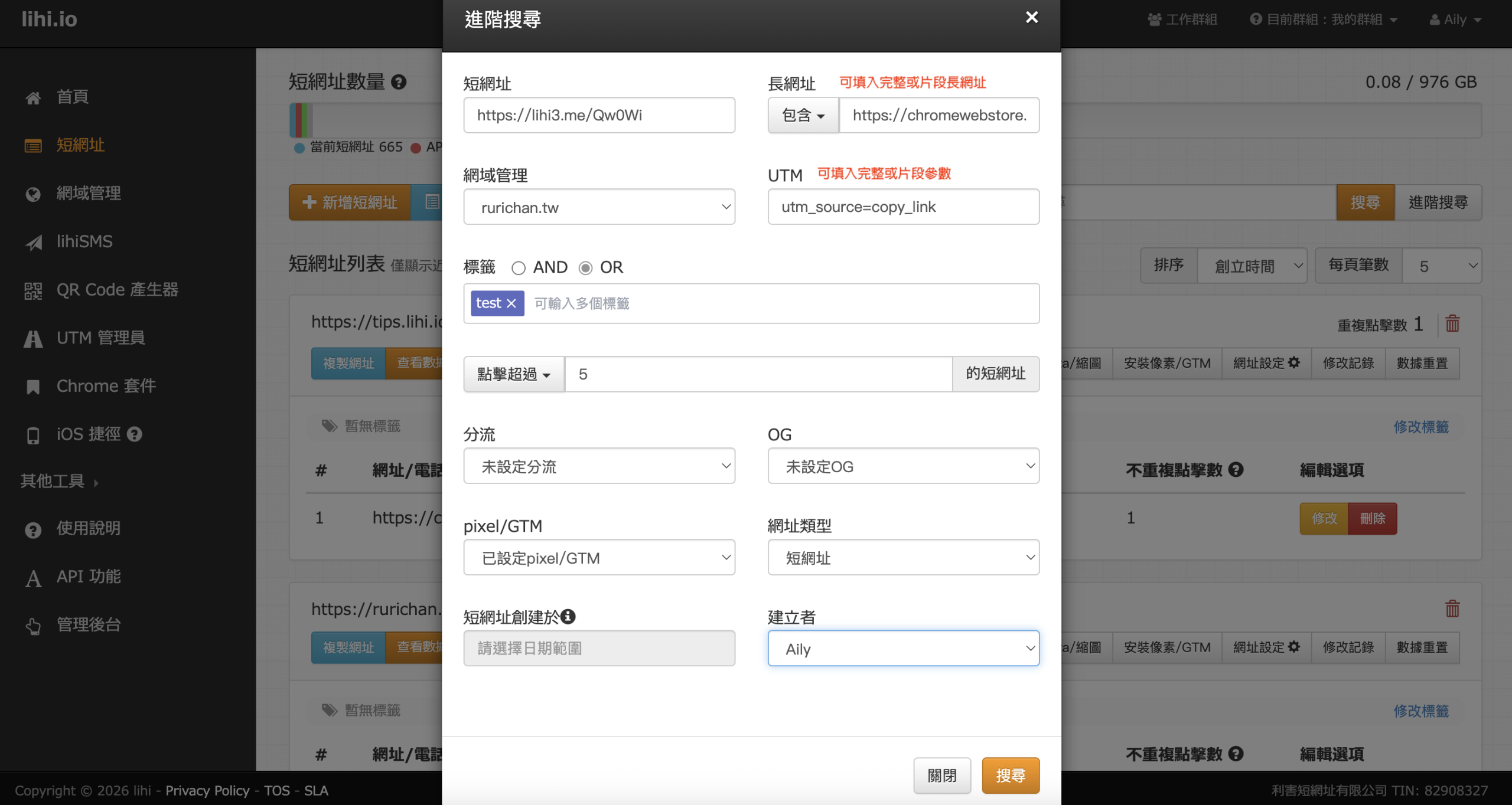 - 基礎資訊: 可透過「短網址」、「長網址」或「網域」進行檢索。