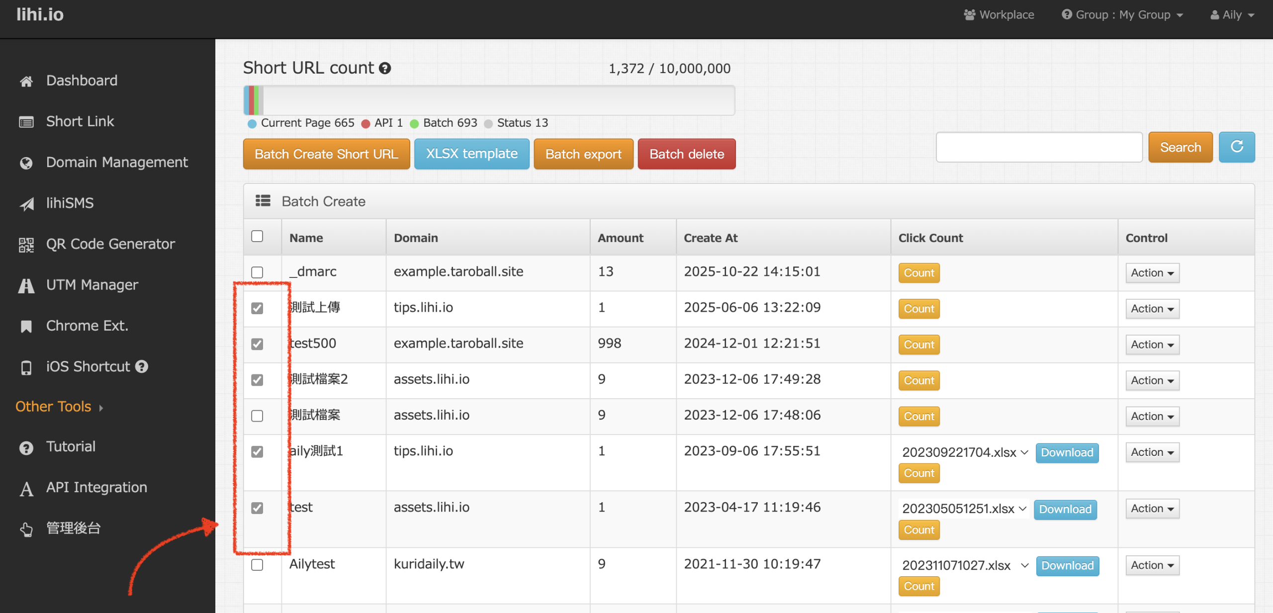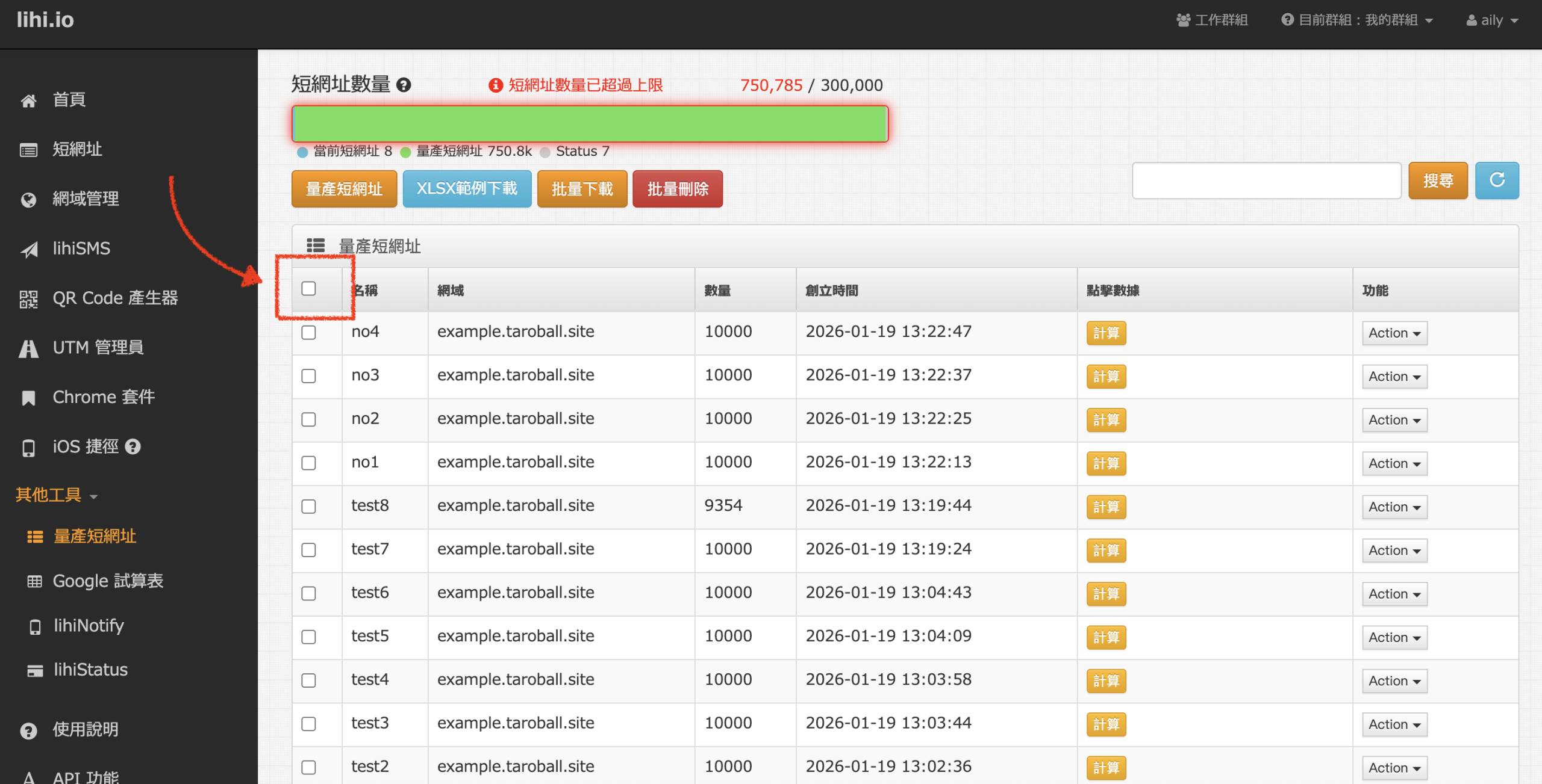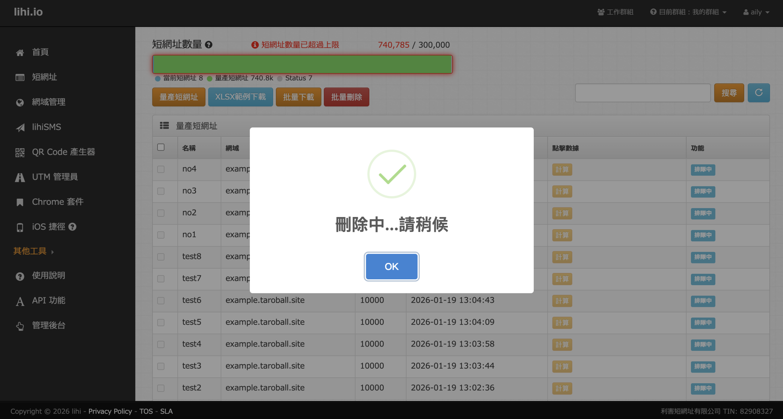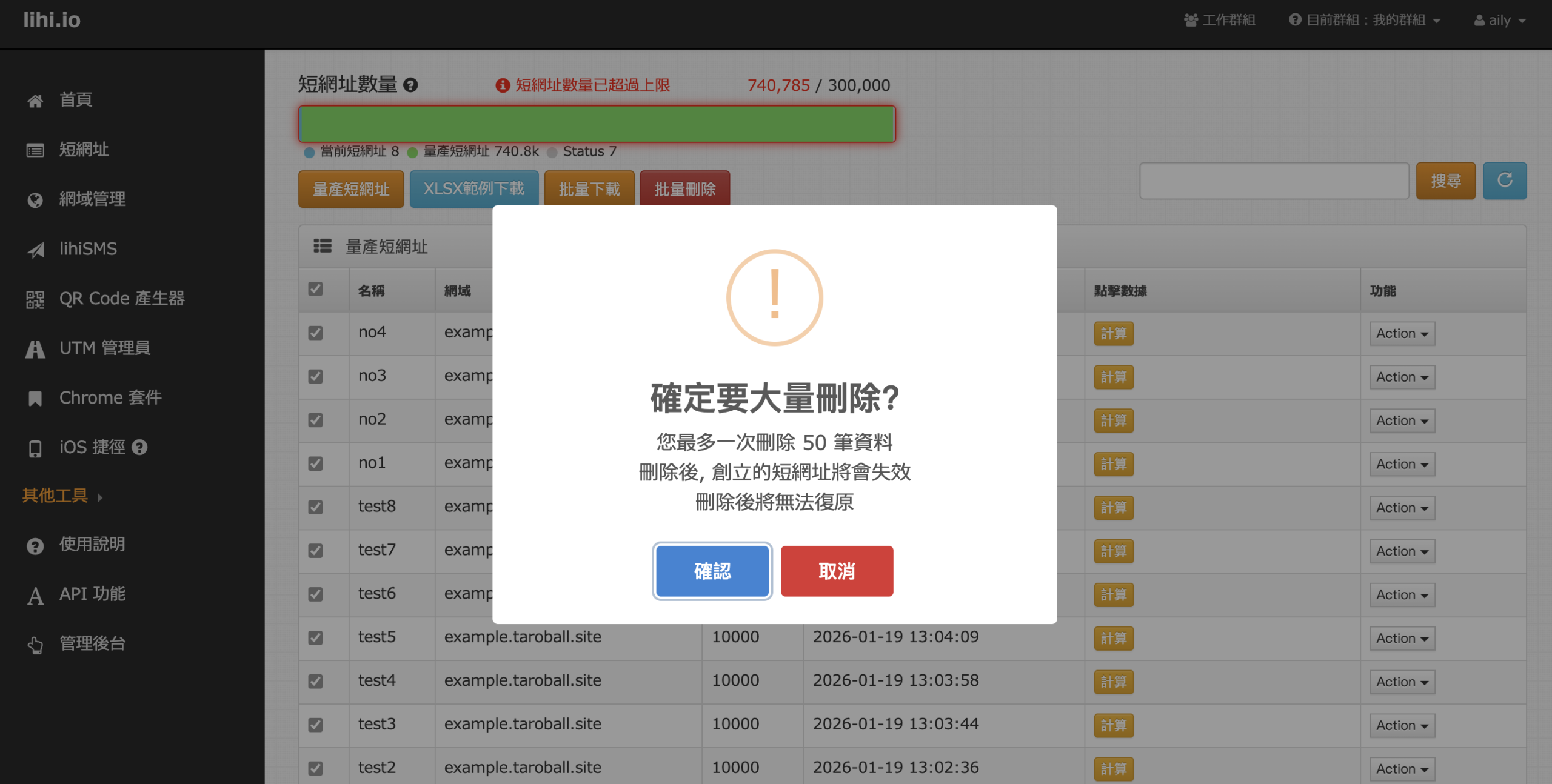 如何批量刪除量產短網址 1、點擊其他工具,點擊量產短網址,勾選左上角的方塊全選要刪除的短網址或是個別勾選要刪除的短網址 2、點擊紅色按鈕批量刪除,點擊確認。 3、點擊ok,即完成刪除。 免費使用 lihi 短網址 ⇒ 點這裡!