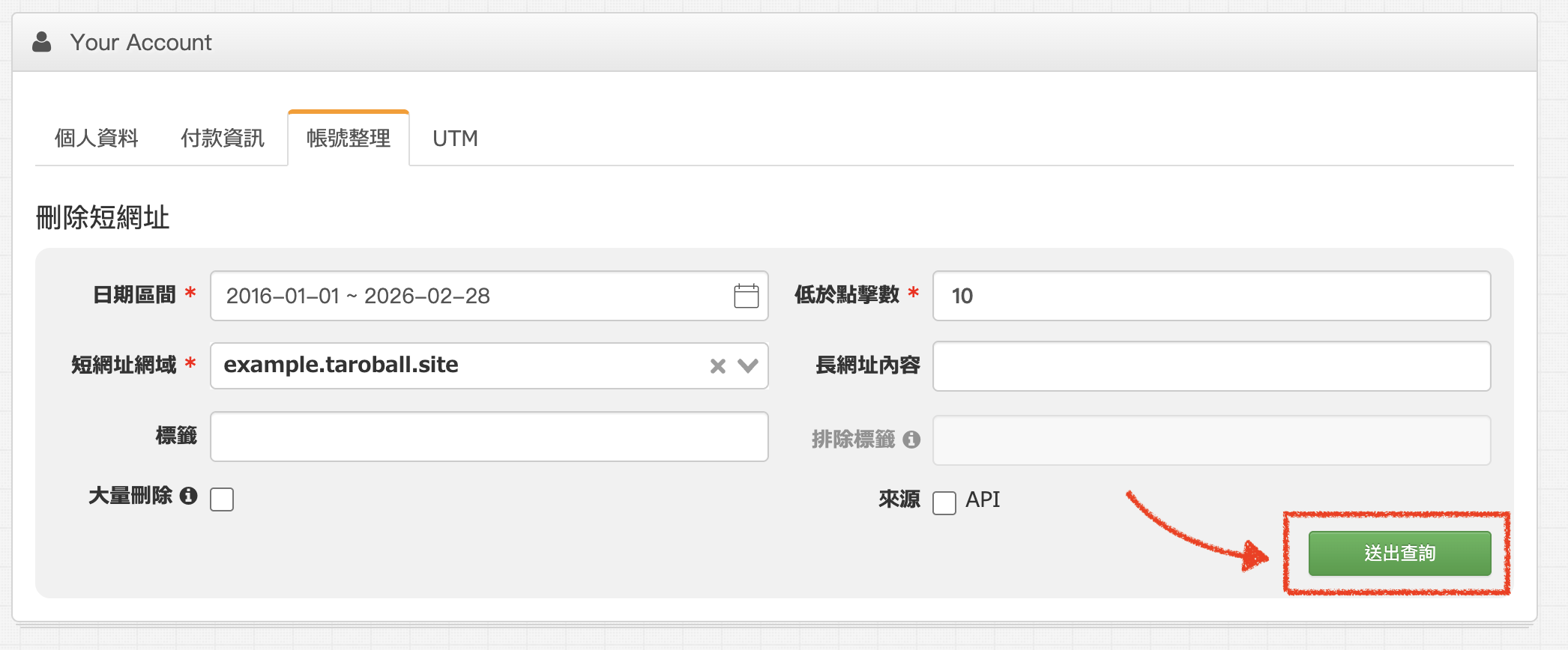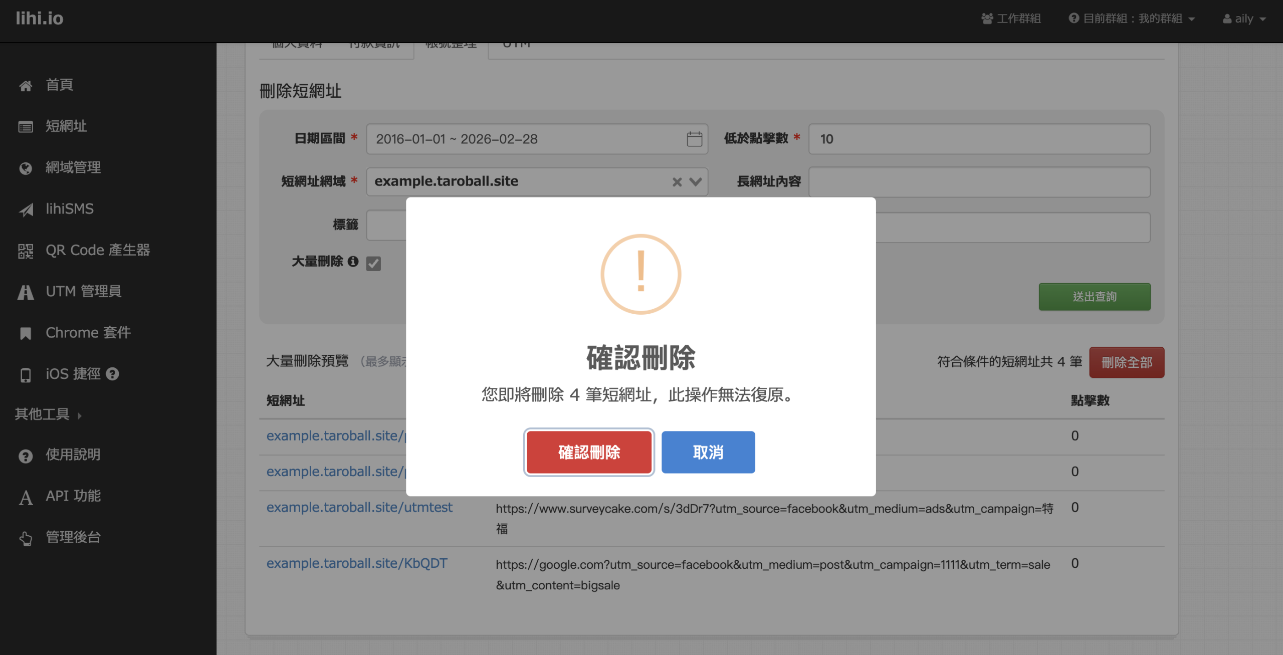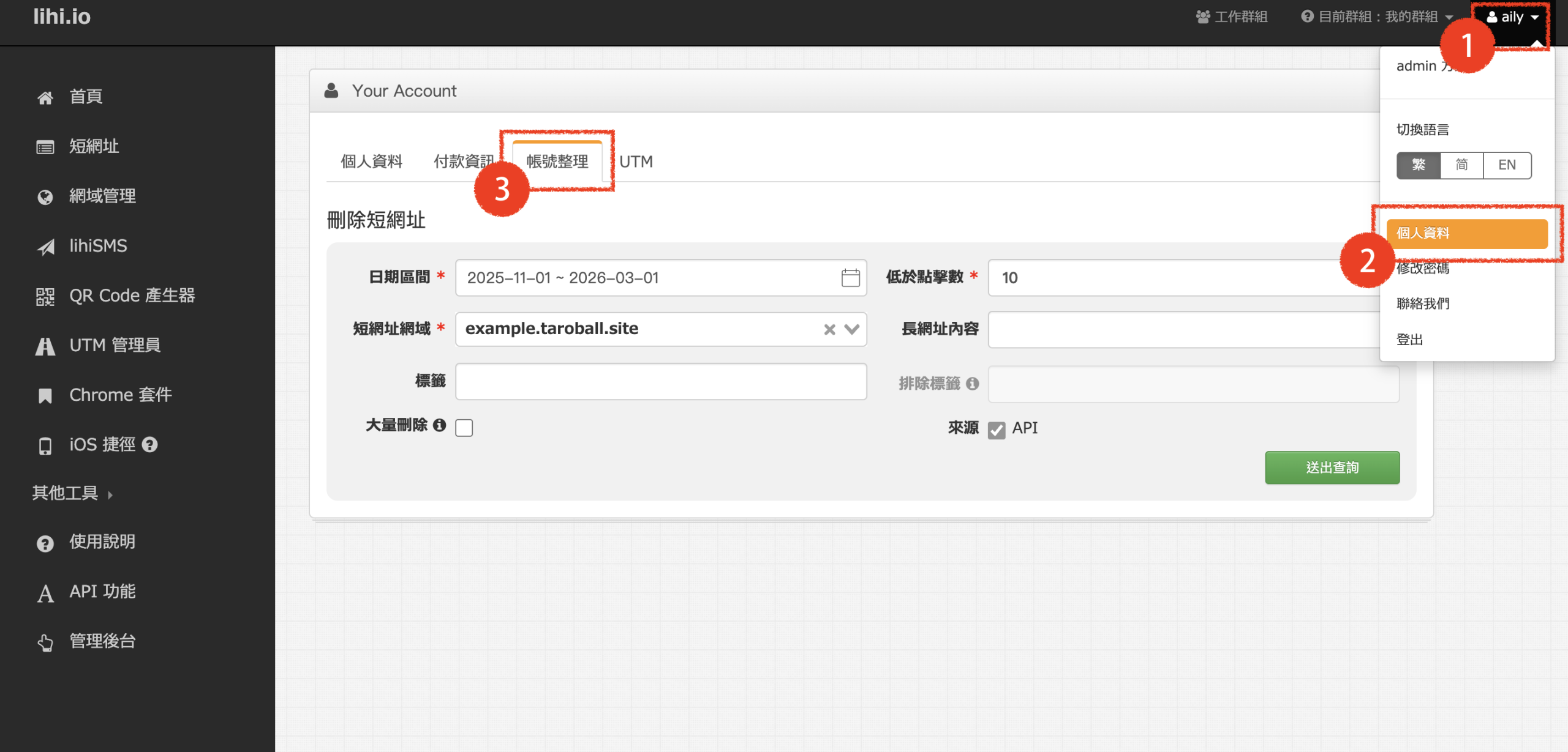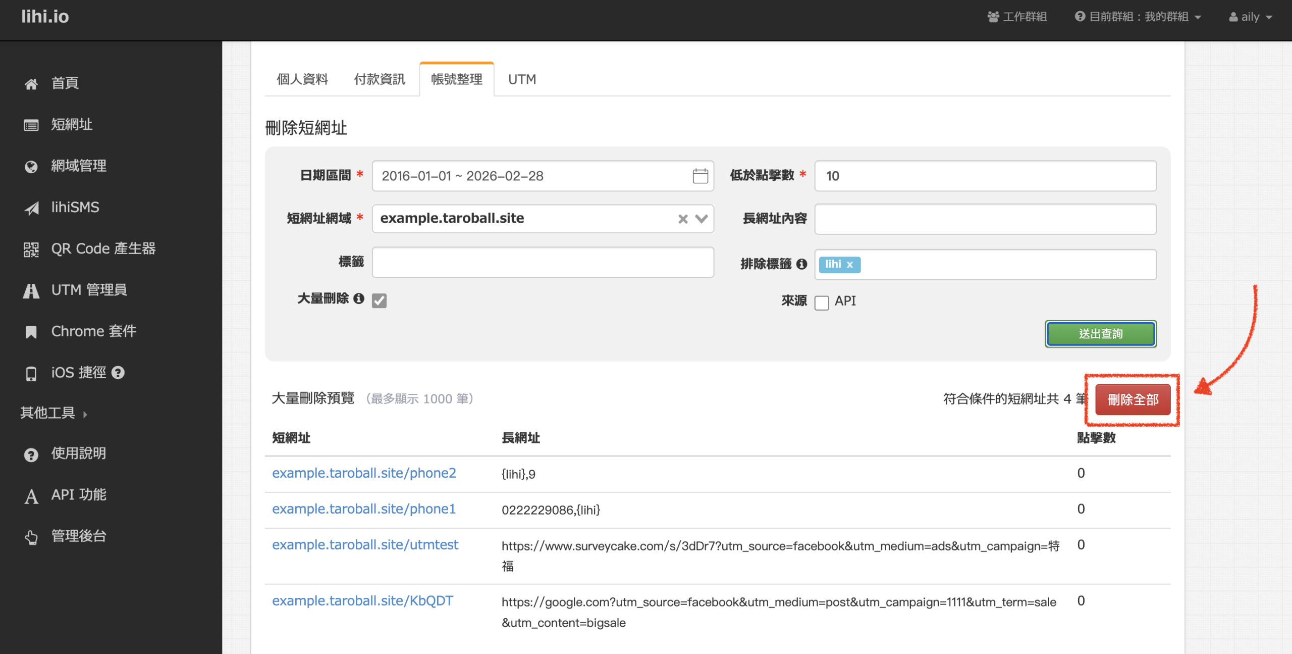 如何批量整理帳號 1、點擊右上角個人資料,點擊帳號整理。 2、依序填寫日期區間、低於點擊數,選擇短網址網域,也可以選填長網址內容、標籤,並勾選大量刪除,點擊送出查詢。(如需包含API建立的短網址,請勾選API) 3、點擊刪除全部確認無誤後再次點擊確認刪除 免費使用 lihi 短網址 ⇒ 點這裡!