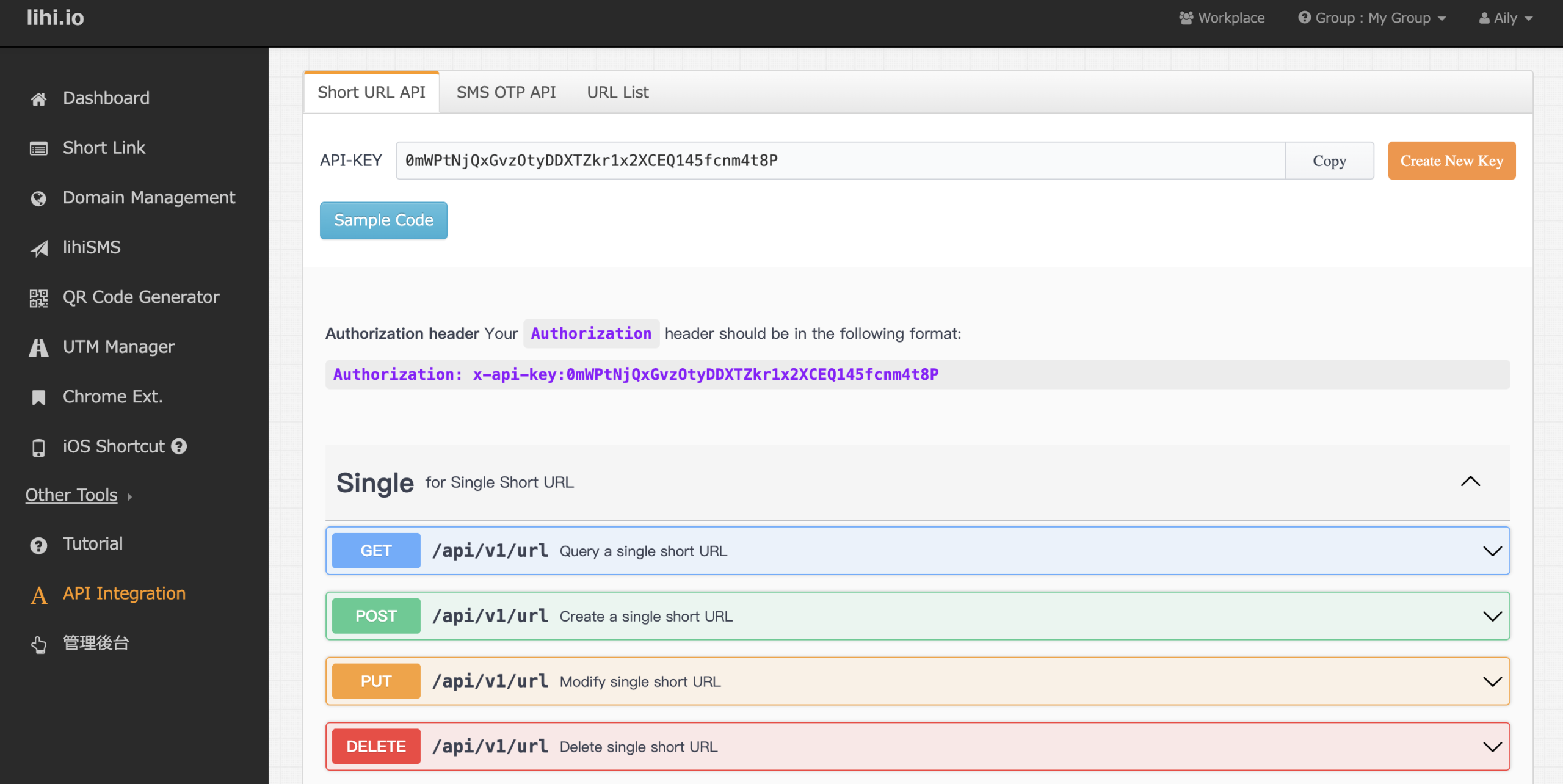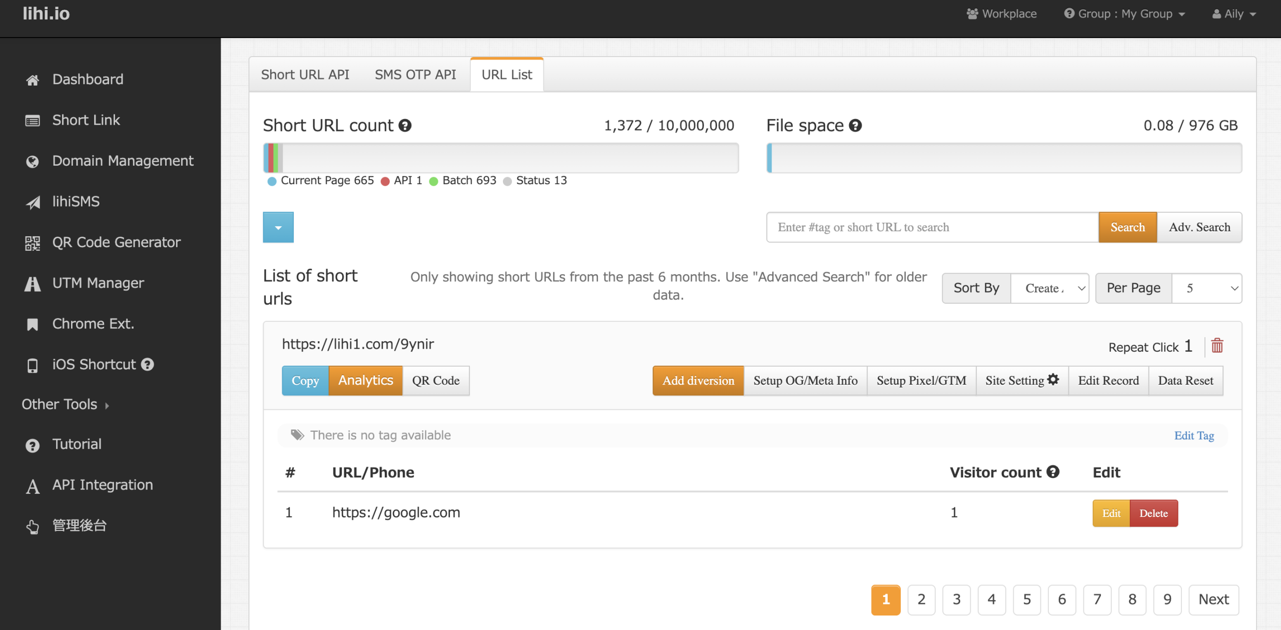 Short links generated via the API will appear in the specific URL List within the dashboard. The interface functions exactly like the main homepage, making it easy to manage and analyze your links.