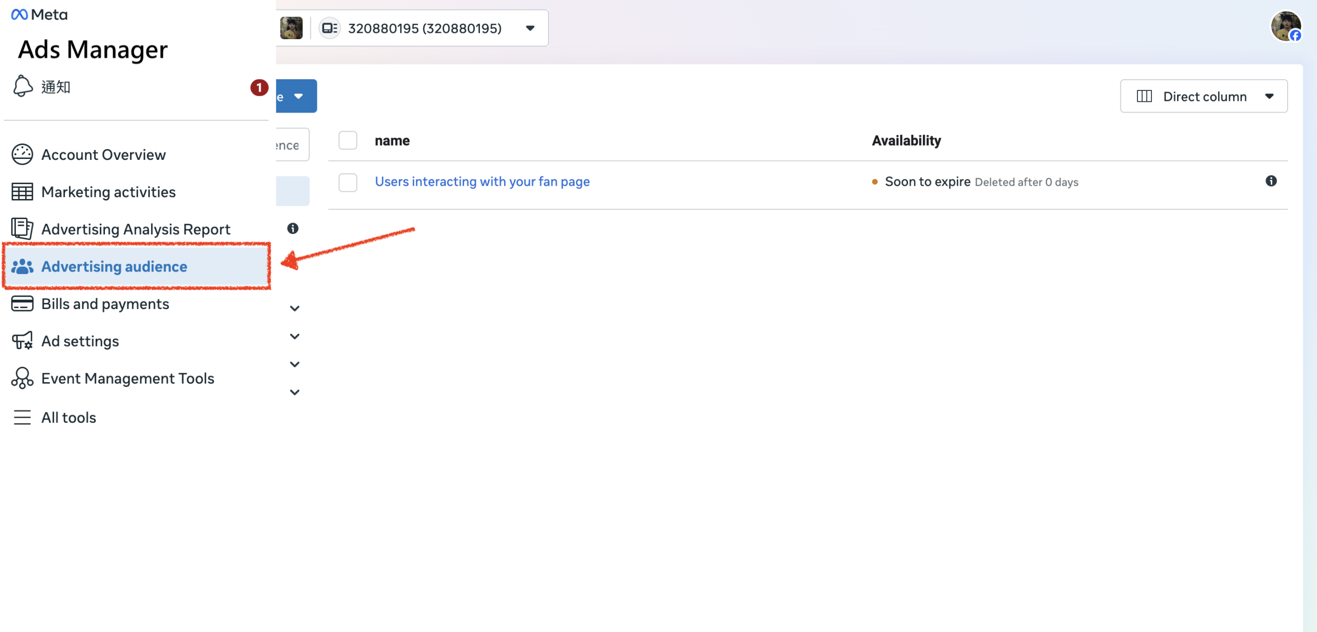- Access Audiences: Go to Facebook Ads Manager, open the “All Tools” menu, and select Advertising audience.