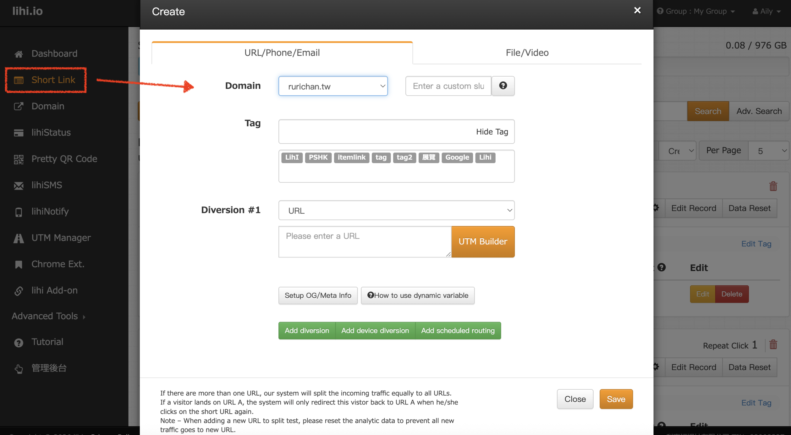 - Enter Details: Click the “New Short URL” button. Fill in the required fields in order: Domain, Tags, and your Destination URL. Once done, click Save.