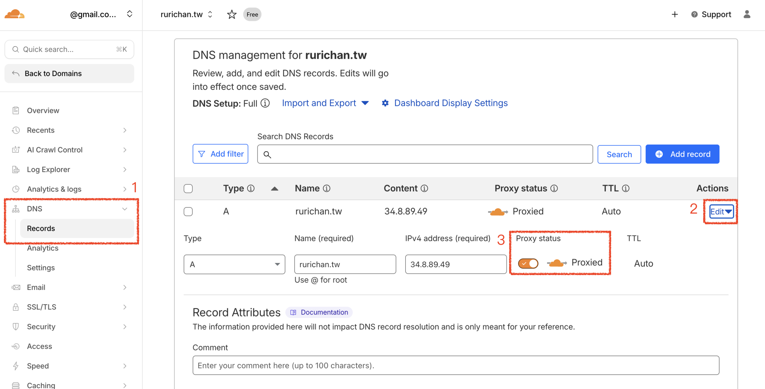 - Toggle the Proxy status switch to Proxied (ensure the cloud icon turns Orange).