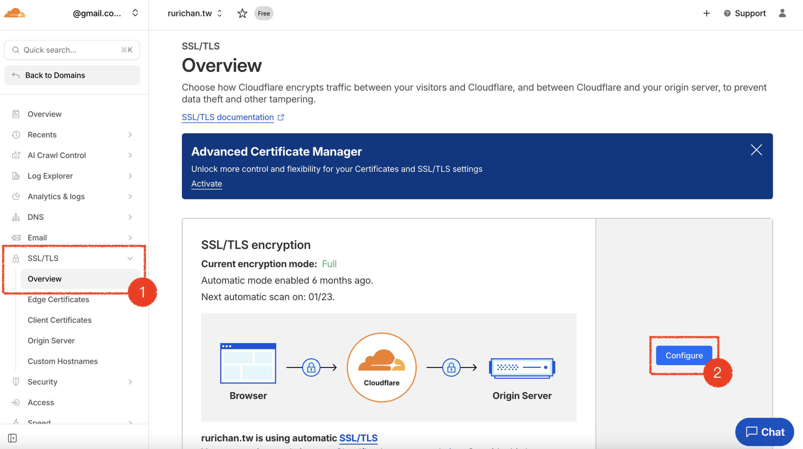- Navigate to SSL Settings: In the left sidebar menu, click SSL/TLS, then select Overview.