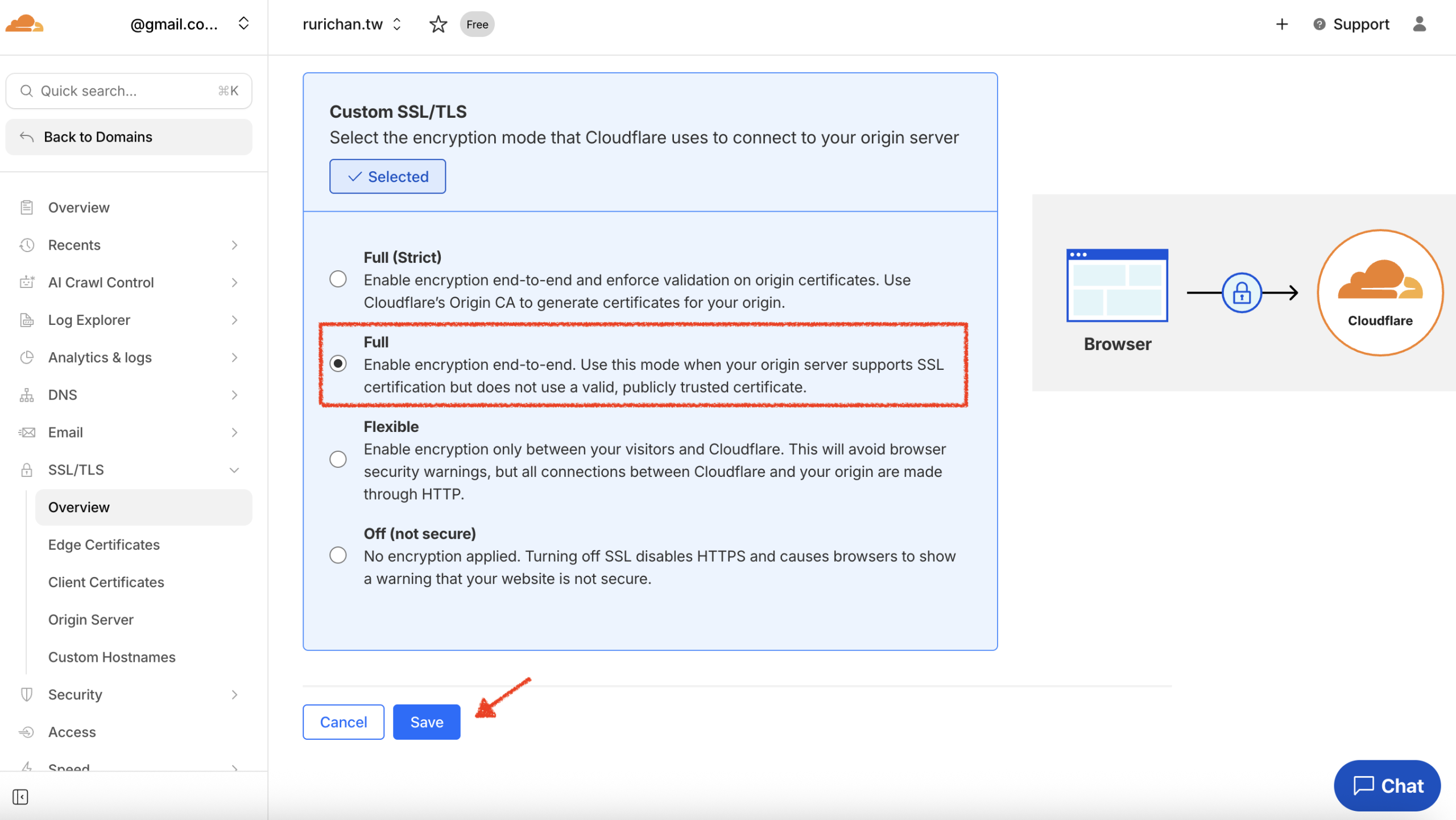 - Select “Full”: Change the SSL/TLS encryption mode to Full. (Note: Do not select “Full (Strict)” if you are encountering this error). Once selected, the settings are applied automatically (or click Save if prompted), and the error should be resolved.