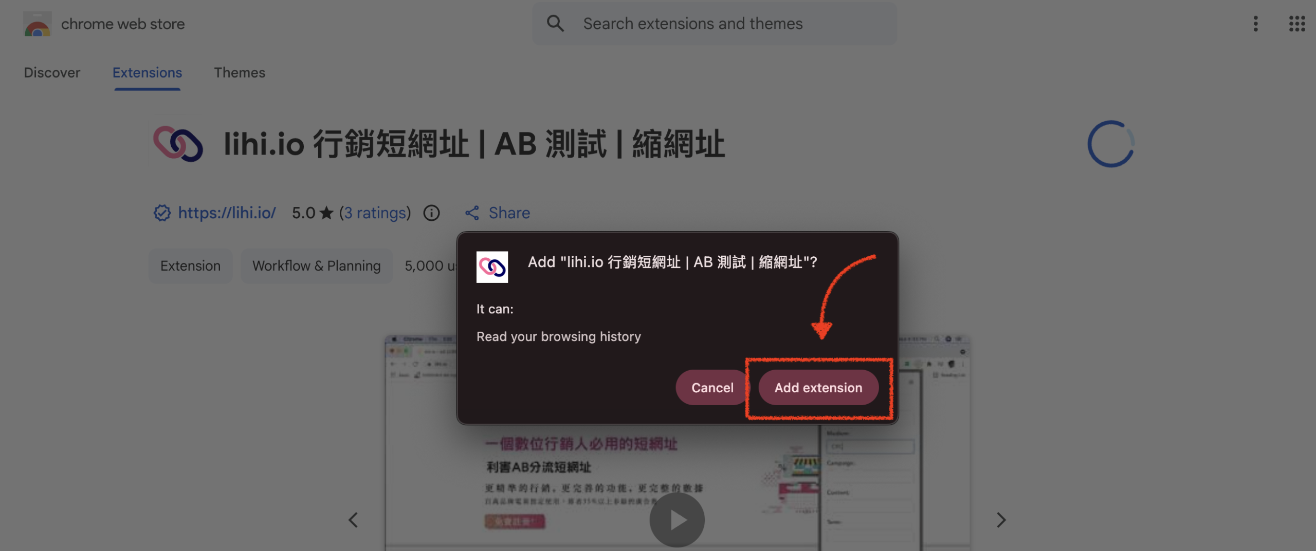 - Confirm Installation: A pop-up window will appear; click Add extension.
