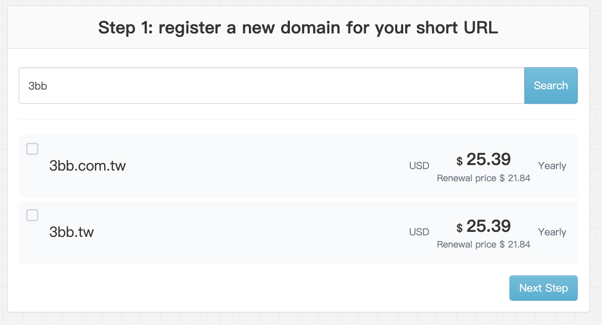 - Select Domain: Choose the domain you wish to purchase from the list and click Next Step.