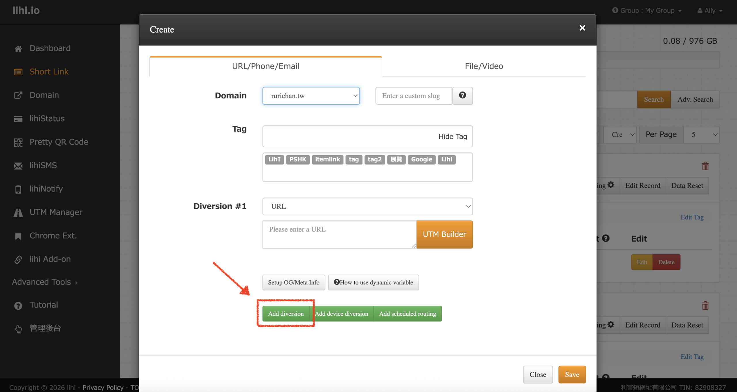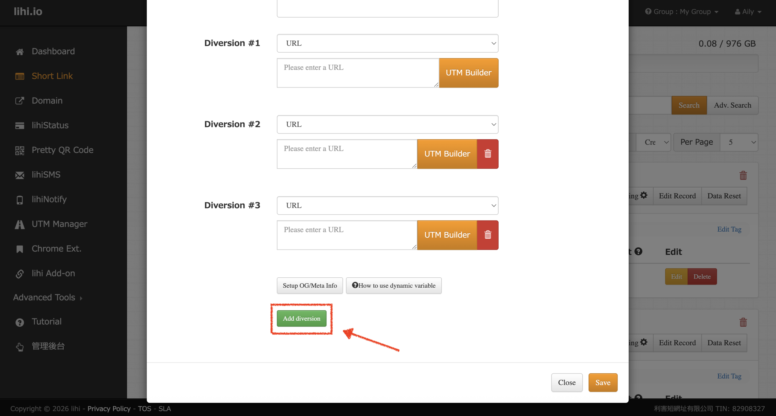 - New Links: When creating a short link, click Add Diversion to input multiple destinations (up to 12).