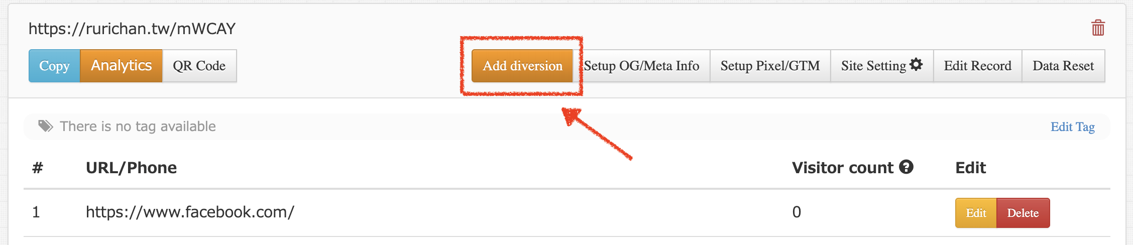 - Existing Links: On the main dashboard, find your link and click the Add Diversion