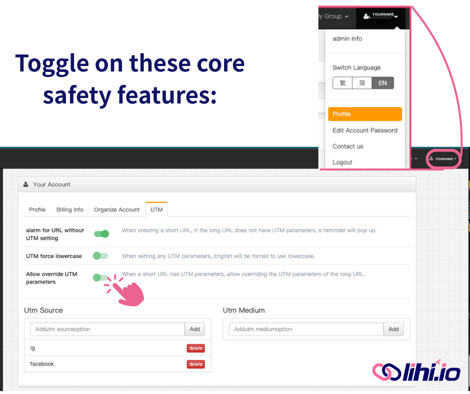Before creating your first UTM link, you should enable the lihi anti‑error mechanisms at the account level. This ensures every teammate follows the same rules.