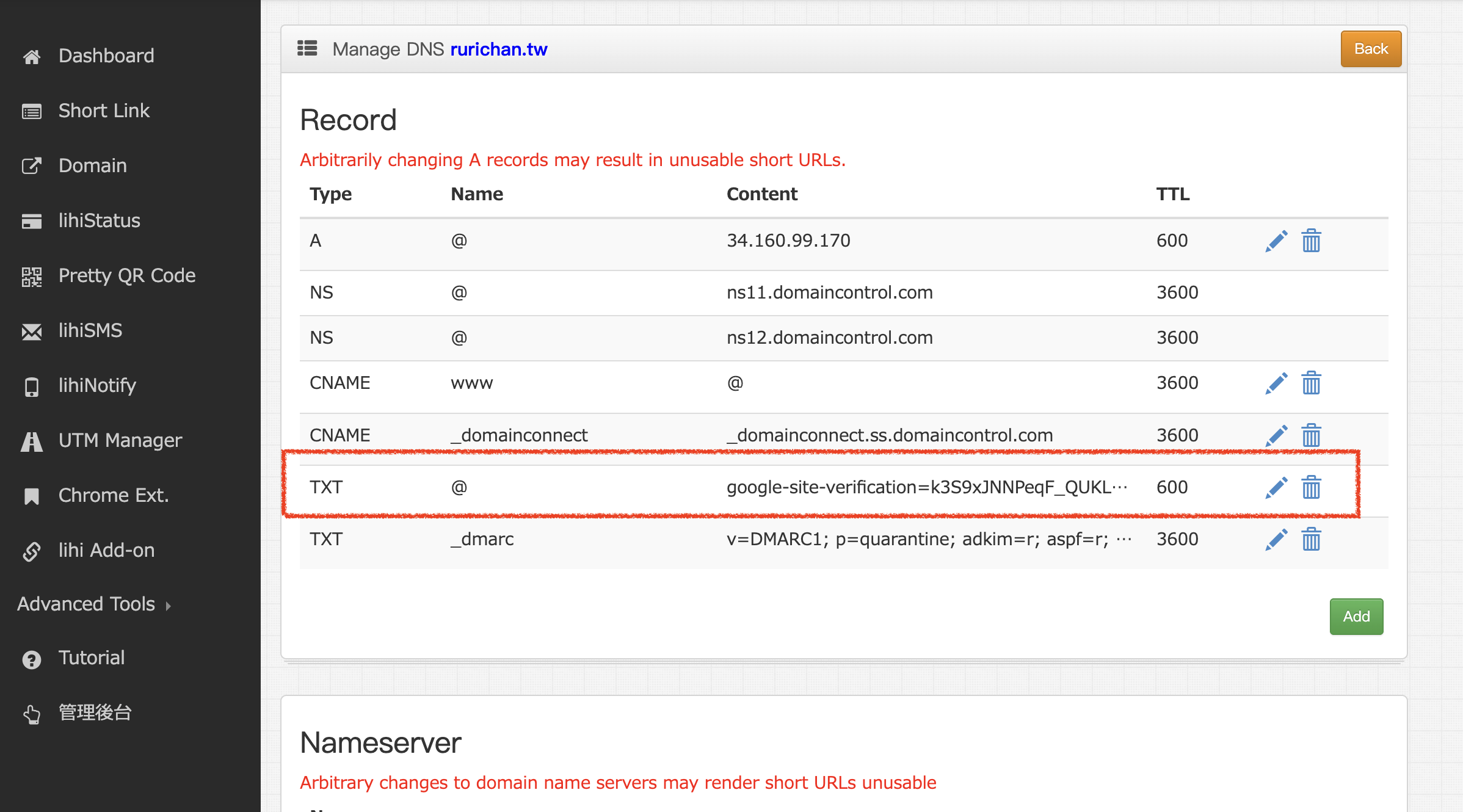 - Fill in the required fields (Type: TXT; Value: Paste the code copied from Google).