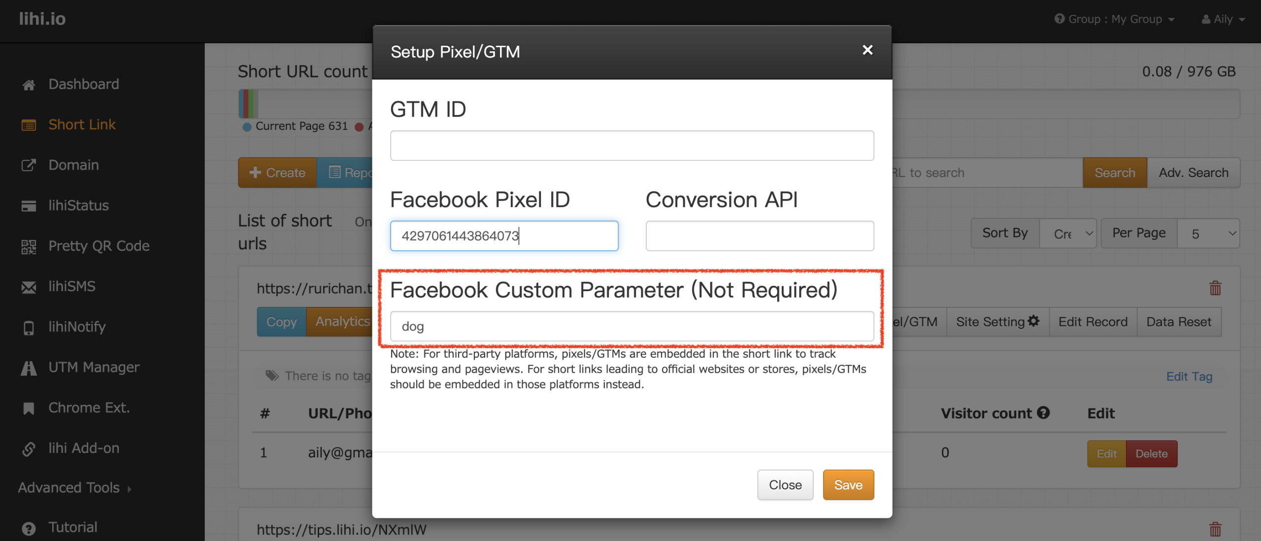 Facebook Custom Parameters allow you to categorize your short links using specific keywords (tags).