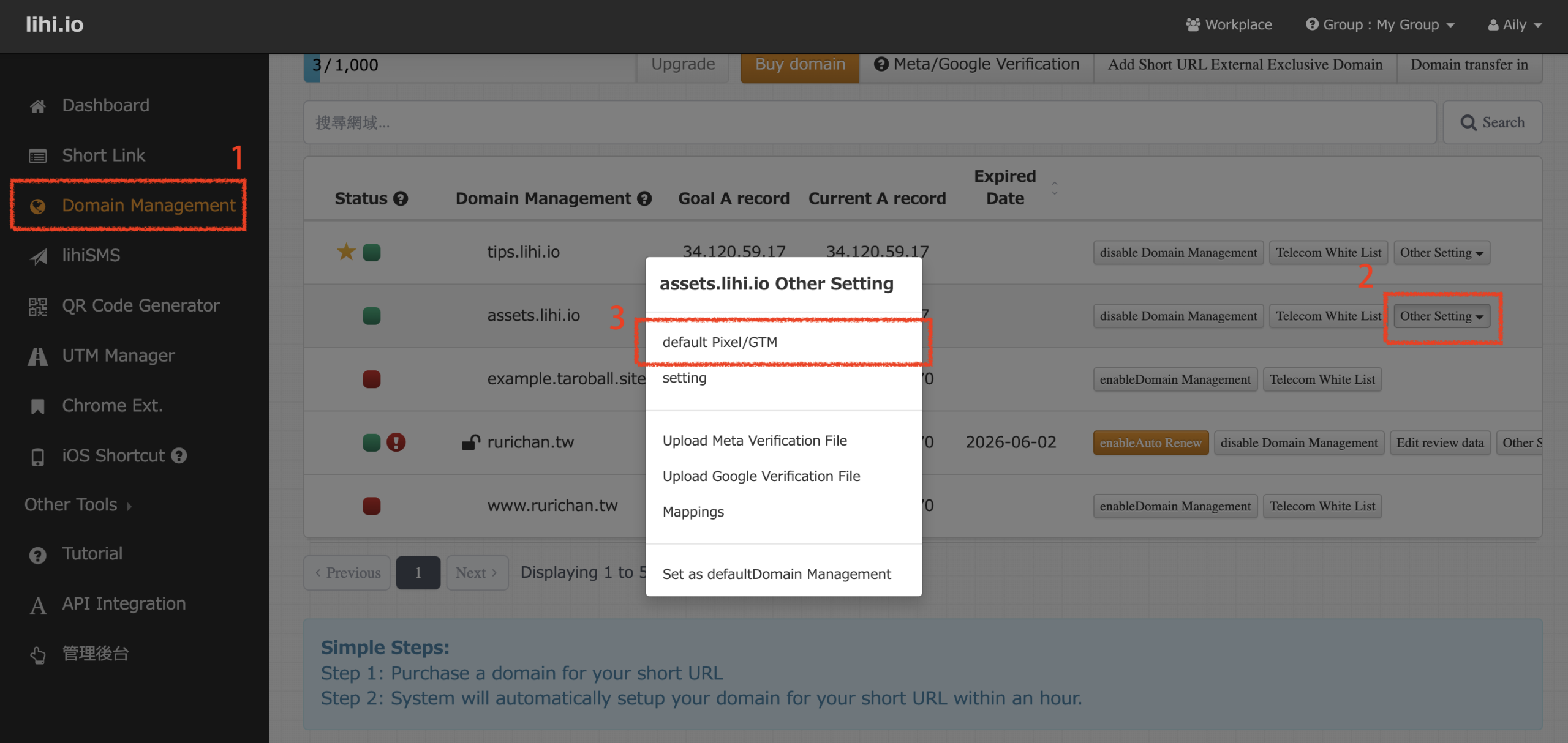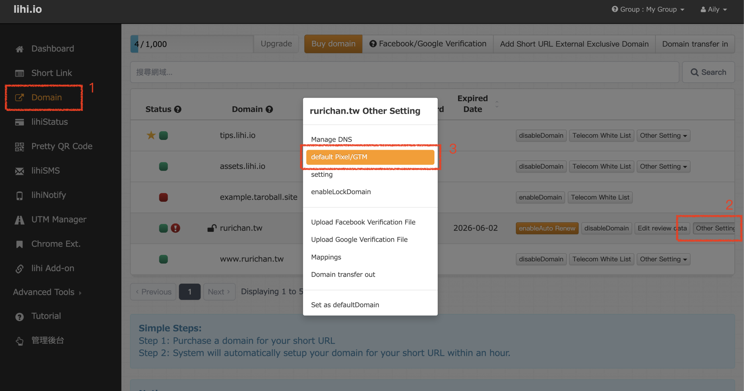 - How: Go to the Domain menu and click Other Setting > click Default Pixel/GTM.