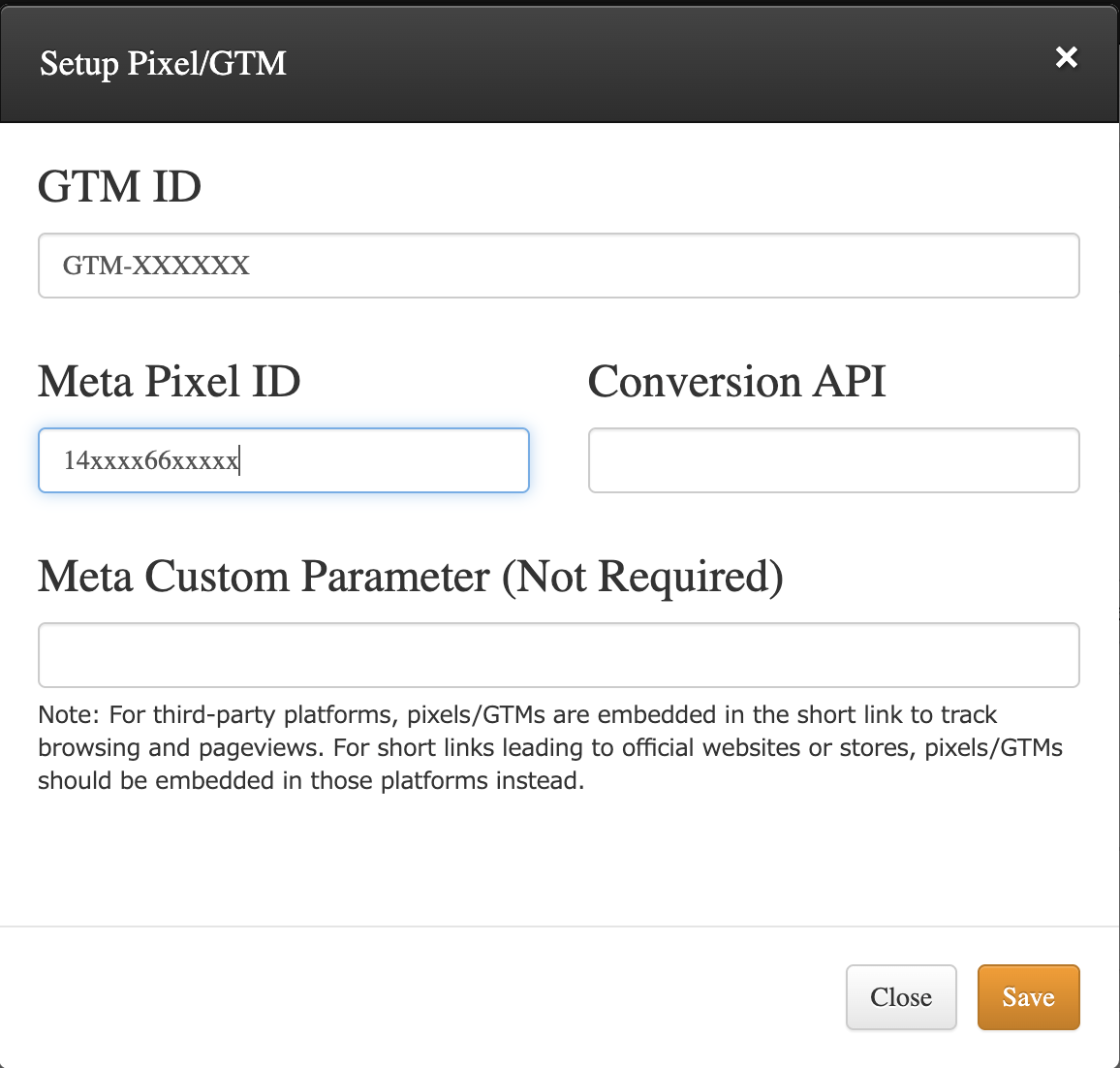 - Enter IDs: Input your Meta Pixel ID or GTM ID into the respective fields and click Save to complete the setup.