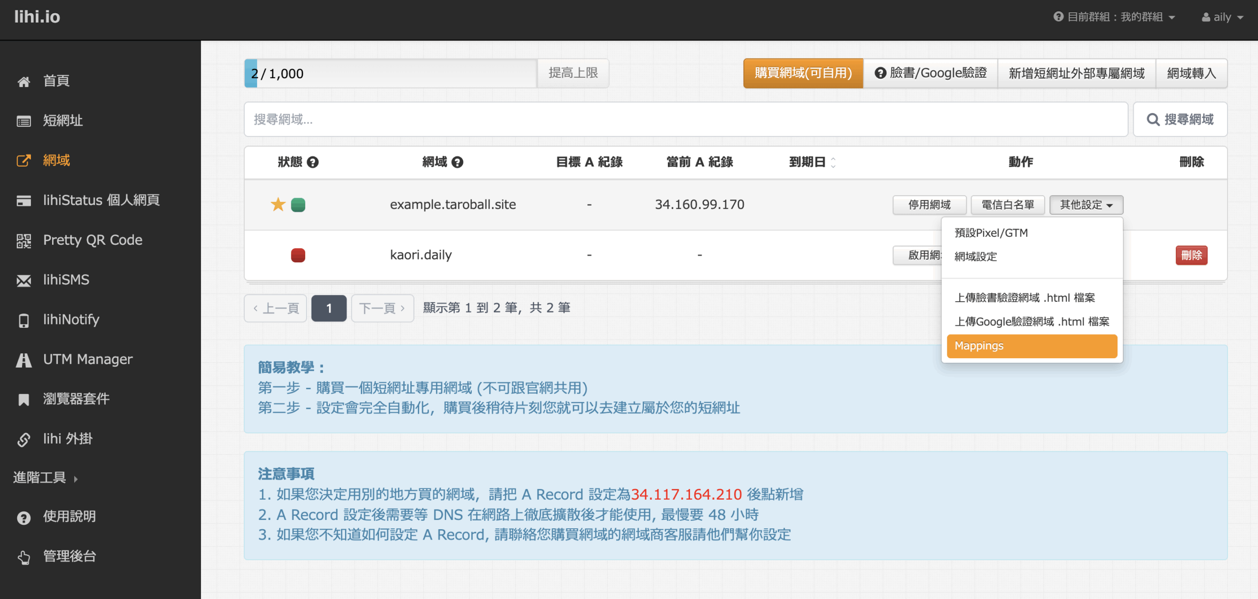 1、於短網址後台點擊網域,找到要設定網域,點擊其他設定,點擊Mappings。