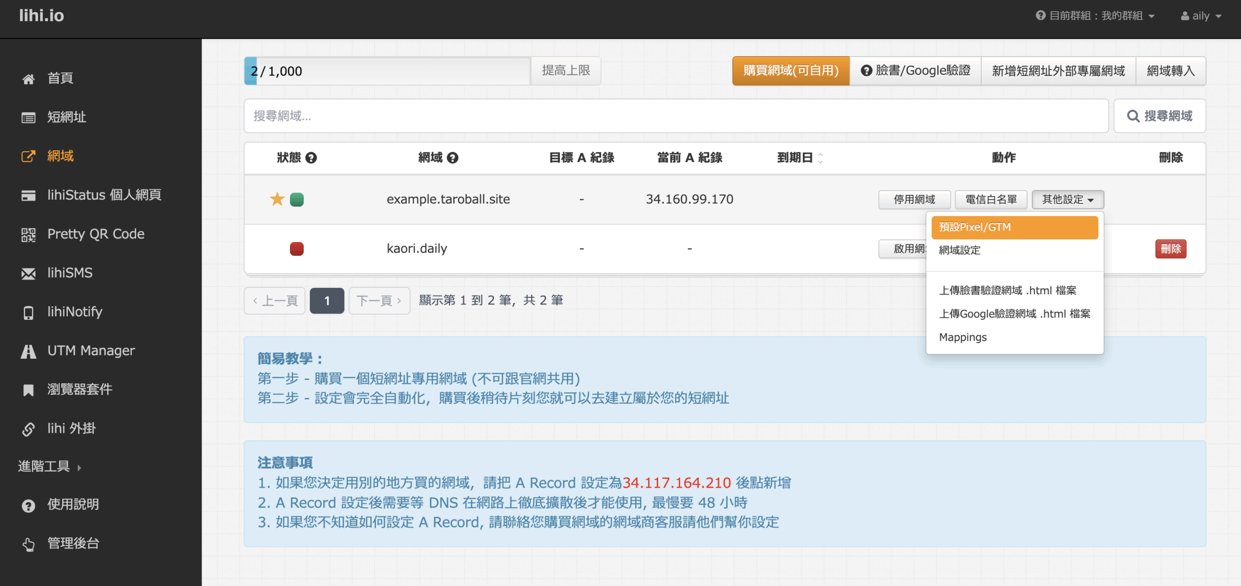*若是擁有自己網域的使用者,可以前往網域點選預設Pixel/GTM設定,之後使用該網域的短網址都將直接套入該組預設,免去每次都要重新輸入的步驟。