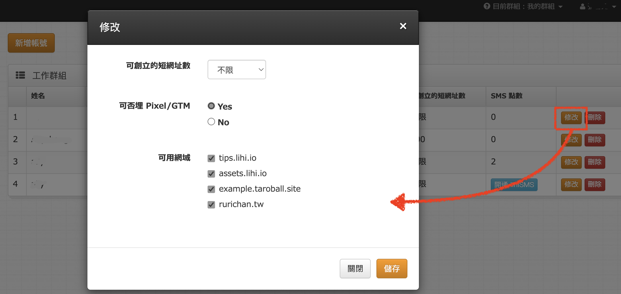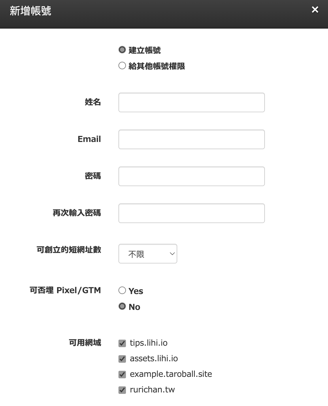 並依序填入所有欄位,並決定該帳號可使用哪謝網域與是否可以埋Pixel/GTM後點擊儲存。