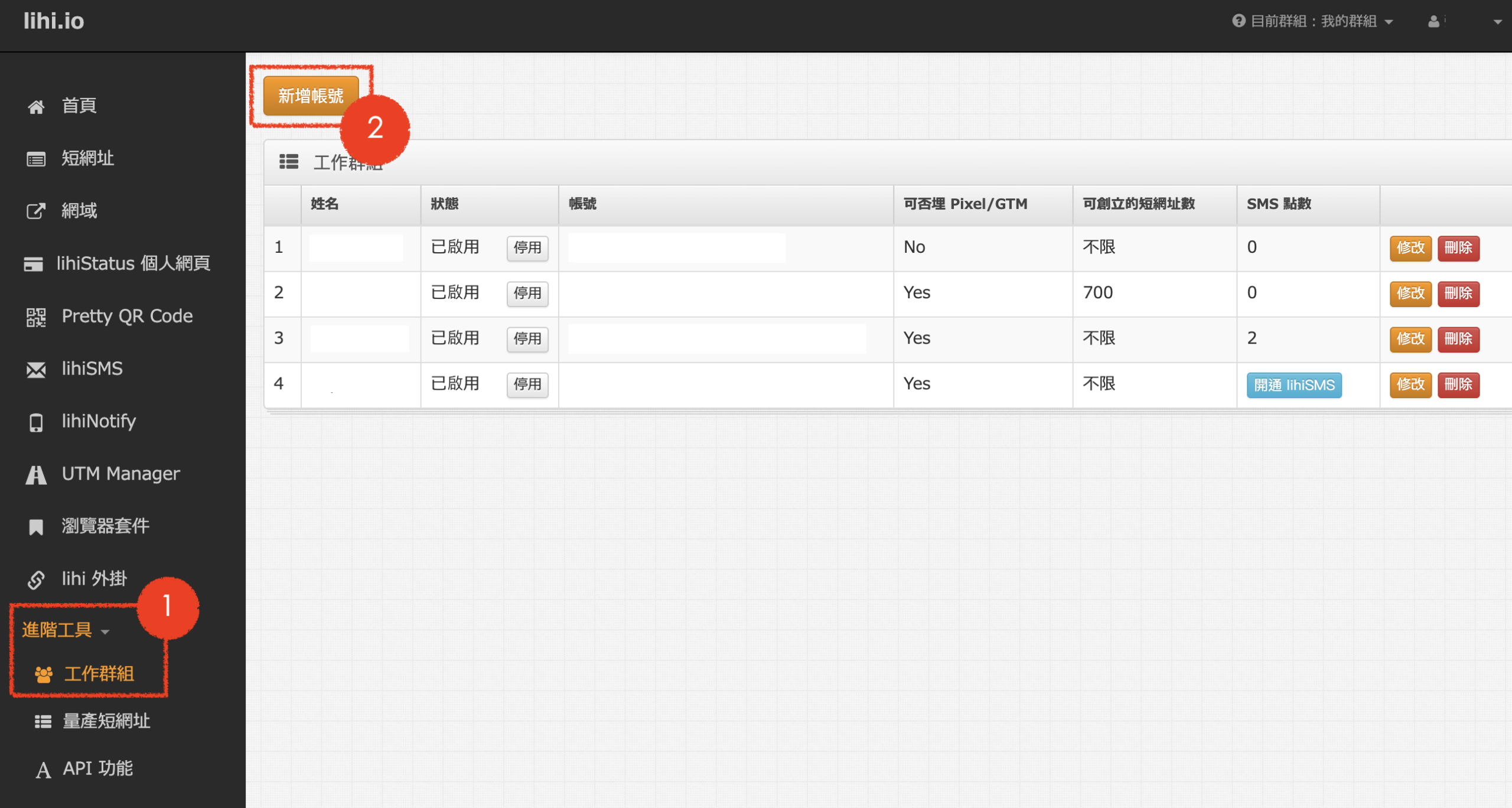 1、點選進階工具,點擊工作群組後,點擊新增帳號。