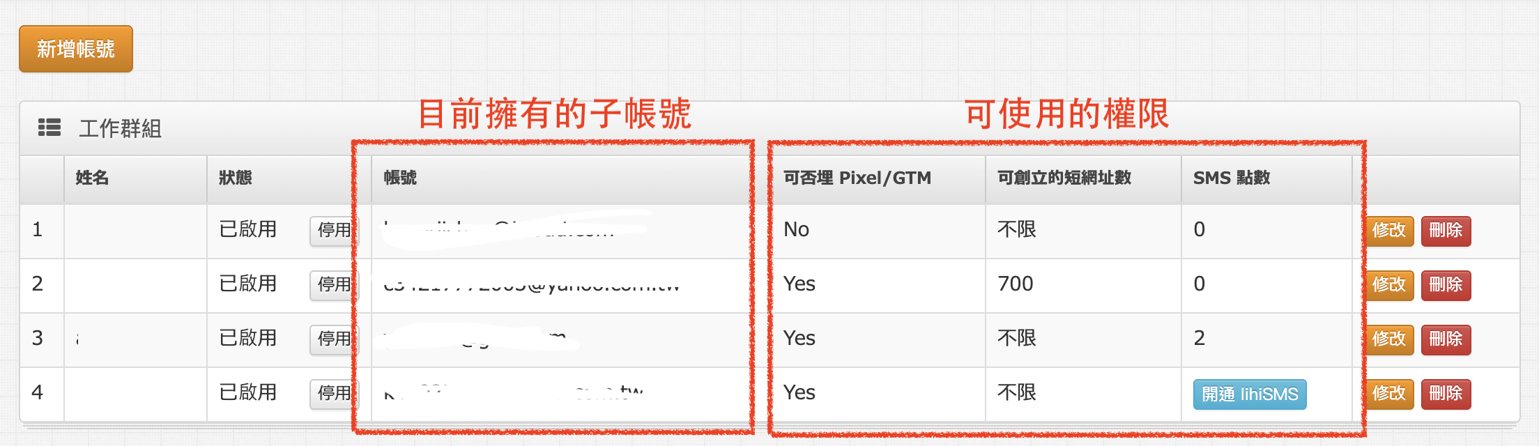 3、工作群組內即會顯示目前擁有的子帳號及其權限。